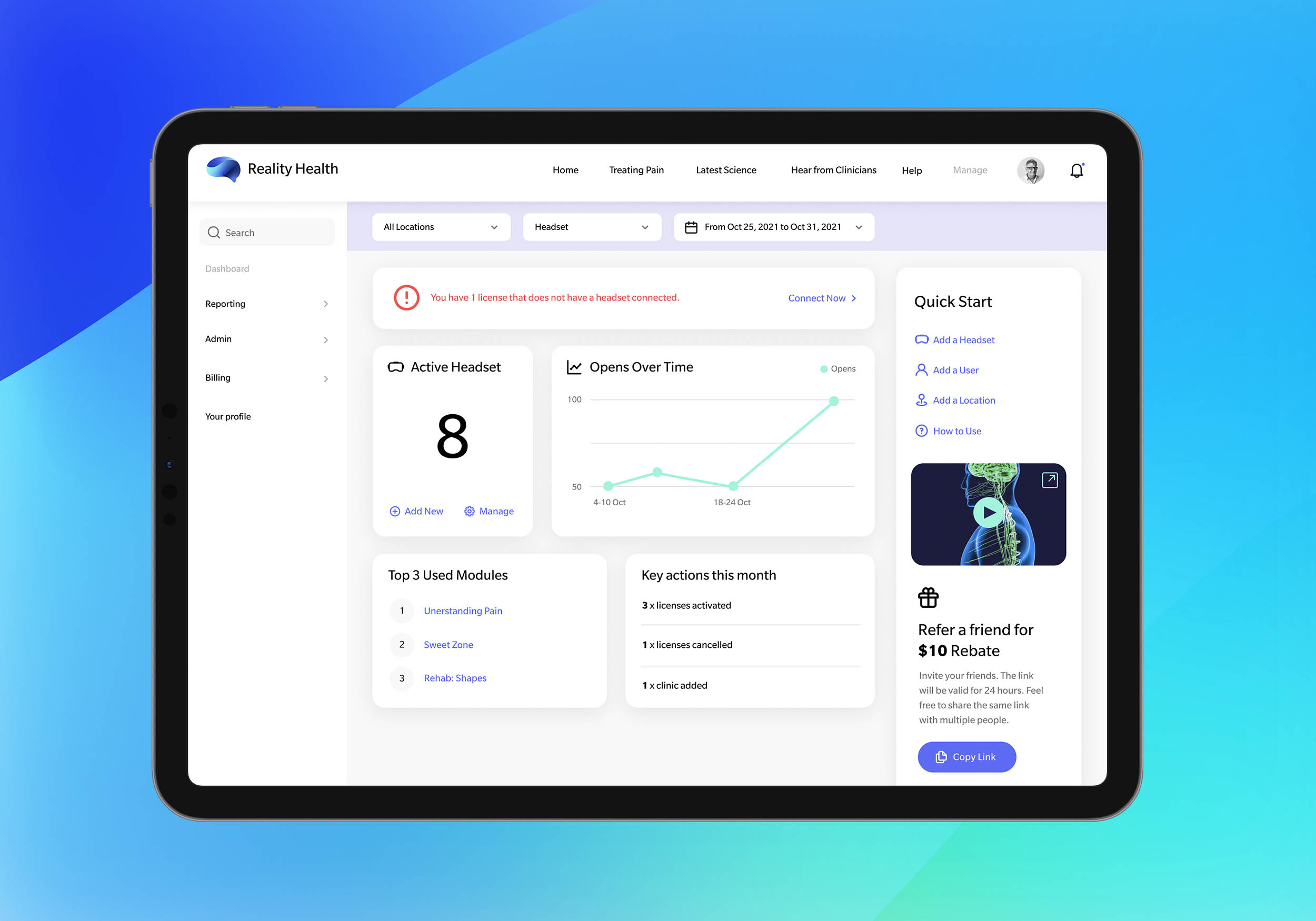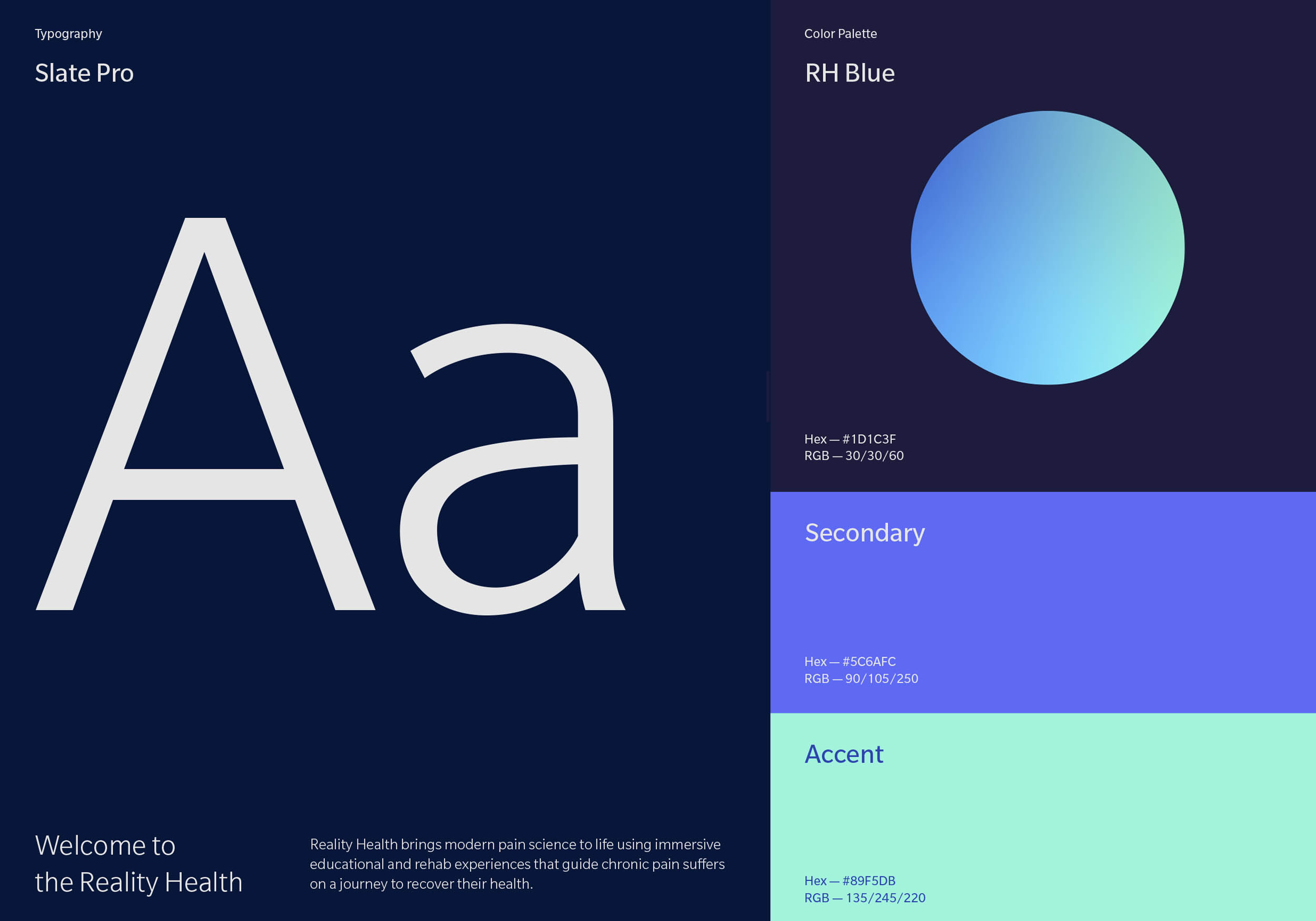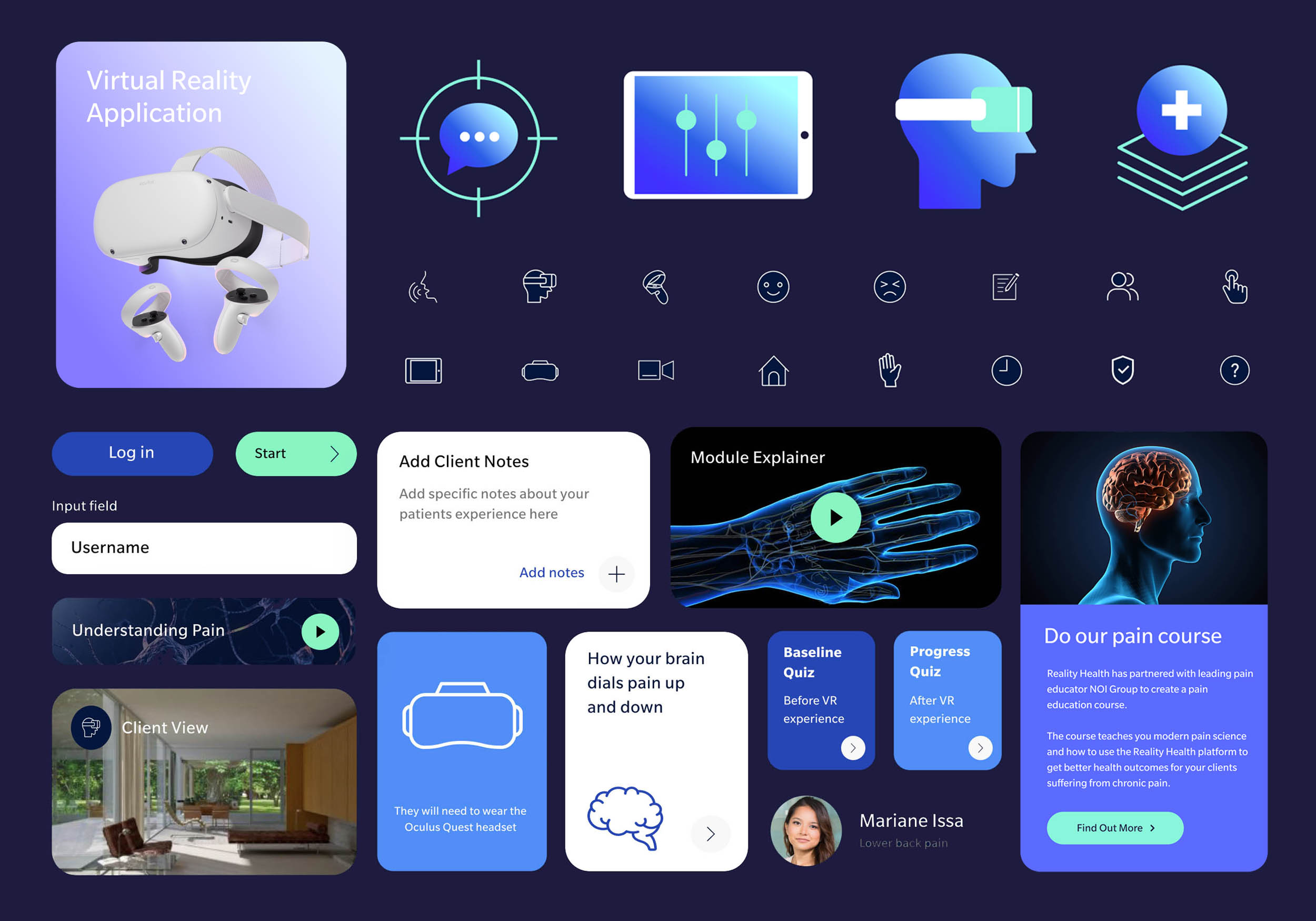 Reality Health is a pioneering digital health platform that transforms modern pain science into immersive, VR-driven rehabilitation experiences. To bring this vision to life, I collaborated directly with the founding team to create the brand identity, marketing website and the design of a high-utility, VR-integrated patient portal. Our partnership resulted in a seamless digital ecosystem that empowers clinicians to deliver more engaging therapy, ultimately driving better recovery outcomes through the power of immersive technology.